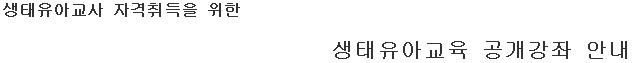 Çѱ¹»ýÅÂÀ¯¾Æ±³À°ÇÐȸ¿¡¼´Â »ýÅÂÀ¯¾Æ±³»ç 3±Þ(75½Ã°£), 2±Þ(150½Ã°£) ÀÚ°ÝÃëµæÀ» À§ÇÑ ¡¸»ýÅÂÀ¯¾Æ±³À°°³·Ð¡¹°Á¸¦ °³¼³¤ý¿î¿µÇϰíÀÚ ÇÕ´Ï´Ù. ÀÌ °Á´ »ýÅÂÀ¯¾Æ±³»ç ÀÚ°ÝÃëµæÀ» À§ÇÑ Çʼö°ú¸ñÀ¸·Î ÃÑ 30½Ã°£À¸·Î ÁøÇàµË´Ï´Ù. À¯¾Æ±³À°±â°üÀÇ ¿øÀå¤ý±³»ç ¹× »ýÅÂÀ¯¾Æ±³»ç ÀÚ°ÝÃëµæ¿¡ °ü½É ÀÖ´Â ºÐµéÀÇ Àû±ØÀûÀÎ Âü¿©¸¦ ¹Ù¶ø´Ï´Ù.